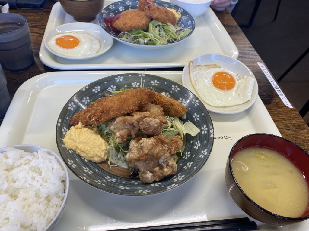 奥のミックスフライ定食は、エビフライ、コロッケ、白身魚フライ、目玉焼き、ご飯、味噌汁で、同じくお野菜もたくさんタルタルソースもたくさん。